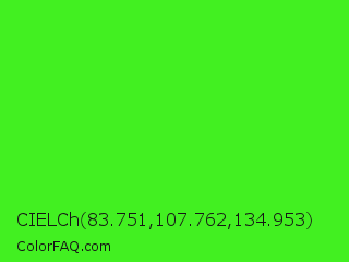 CIELCh 83.751,107.762,134.953 Color is a normal green color and the nearest color is Neon Green #39ff14. Hex code #42f021 and RGB value is rgb(66,240,33). In RGB color space, this color is composed of 26% red, 94% green, 13% blue, In CMYK color space, this color is composed of 73% cyan, 0% magenta, 86% yellow , 6% black , In HSL color space, this color has a hue angle of 110° , 87% saturation and 54% lightness.