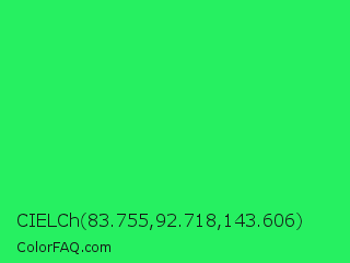 CIELCh 83.755,92.718,143.606 Color is a normal green color and the nearest color is Malachite #0bda51. Hex code #26f061 and RGB value is rgb(38,240,97). In RGB color space, this color is composed of 15% red, 94% green, 38% blue, In CMYK color space, this color is composed of 84% cyan, 0% magenta, 60% yellow , 6% black , In HSL color space, this color has a hue angle of 138° , 87% saturation and 55% lightness.