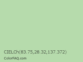 CIELCh 83.75,28.32,137.372 Color is a light green color and the nearest color is Moss Green #addfad. Hex code #b6dbac and RGB value is rgb(182,219,172). In RGB color space, this color is composed of 71% red, 86% green, 67% blue, In CMYK color space, this color is composed of 17% cyan, 0% magenta, 21% yellow , 14% black , In HSL color space, this color has a hue angle of 107° , 39% saturation and 77% lightness.