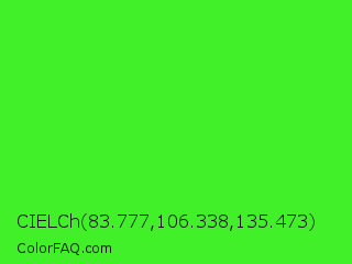 CIELCh 83.777,106.338,135.473 Color is a normal green color and the nearest color is Neon Green #39ff14. Hex code #42f029 and RGB value is rgb(66,240,41). In RGB color space, this color is composed of 26% red, 94% green, 16% blue, In CMYK color space, this color is composed of 73% cyan, 0% magenta, 83% yellow , 6% black , In HSL color space, this color has a hue angle of 112° , 87% saturation and 55% lightness.