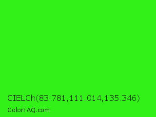 CIELCh 83.781,111.014,135.346 Color is a normal green color and the nearest color is Neon Green #39ff14. Hex code #32f116 and RGB value is rgb(50,241,22). In RGB color space, this color is composed of 20% red, 95% green, 9% blue, In CMYK color space, this color is composed of 79% cyan, 0% magenta, 91% yellow , 5% black , In HSL color space, this color has a hue angle of 112° , 89% saturation and 52% lightness.