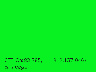 CIELCh 83.785,111.912,137.046 Color is a normal green color and the nearest color is Green #00ff00. Hex code #07f220 and RGB value is rgb(7,242,32). In RGB color space, this color is composed of 3% red, 95% green, 13% blue, In CMYK color space, this color is composed of 97% cyan, 0% magenta, 87% yellow , 5% black , In HSL color space, this color has a hue angle of 126° , 94% saturation and 49% lightness.