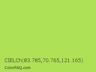 CIELCh 83.785,70.765,121.165 Color is a light green color and the nearest color is Conifer #acdd4d. Hex code #afe157 and RGB value is rgb(175,225,87). In RGB color space, this color is composed of 69% red, 88% green, 34% blue, In CMYK color space, this color is composed of 22% cyan, 0% magenta, 61% yellow , 12% black , In HSL color space, this color has a hue angle of 82° , 70% saturation and 61% lightness.