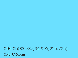 CIELCh 83.787,34.995,225.725 Color is a light cyan color and the nearest color is Spray #79deec. Hex code #6be0ff and RGB value is rgb(107,224,255). In RGB color space, this color is composed of 42% red, 88% green, 100% blue, In CMYK color space, this color is composed of 58% cyan, 12% magenta, 0% yellow , 0% black , In HSL color space, this color has a hue angle of 193° , 100% saturation and 71% lightness.