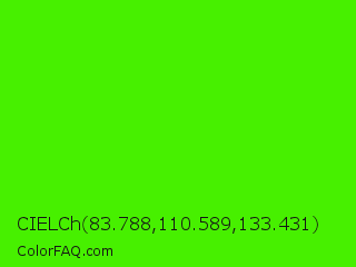 CIELCh 83.788,110.589,133.431 Color is a normal green color and the nearest color is Chlorophyll Green #4aff00. Hex code #47f000 and RGB value is rgb(71,240,0). In RGB color space, this color is composed of 28% red, 94% green, 0% blue, In CMYK color space, this color is composed of 70% cyan, 0% magenta, 100% yellow , 6% black , In HSL color space, this color has a hue angle of 102° , 100% saturation and 47% lightness.