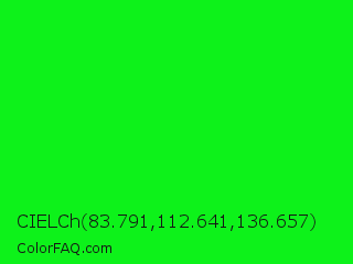 CIELCh 83.791,112.641,136.657 Color is a normal green color and the nearest color is Green #00ff00. Hex code #0df21a and RGB value is rgb(13,242,26). In RGB color space, this color is composed of 5% red, 95% green, 10% blue, In CMYK color space, this color is composed of 95% cyan, 0% magenta, 89% yellow , 5% black , In HSL color space, this color has a hue angle of 123° , 90% saturation and 50% lightness.