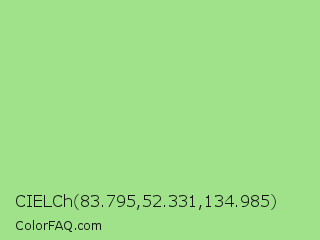 CIELCh 83.795,52.331,134.985 Color is a light green color and the nearest color is Feijoa #9fdd8c. Hex code #a0e289 and RGB value is rgb(160,226,137). In RGB color space, this color is composed of 63% red, 89% green, 54% blue, In CMYK color space, this color is composed of 29% cyan, 0% magenta, 39% yellow , 11% black , In HSL color space, this color has a hue angle of 104° , 61% saturation and 71% lightness.