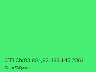 CIELCh 83.804,82.498,145.236 Color is a normal green color and the nearest color is UFO Green #3cd070. Hex code #46ee73 and RGB value is rgb(70,238,115). In RGB color space, this color is composed of 27% red, 93% green, 45% blue, In CMYK color space, this color is composed of 71% cyan, 0% magenta, 52% yellow , 7% black , In HSL color space, this color has a hue angle of 136° , 83% saturation and 60% lightness.