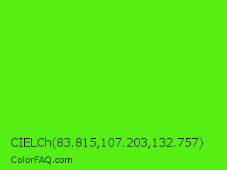 CIELCh 83.815,107.203,132.757 Color is a normal green color and the nearest color is Chlorophyll Green #4aff00. Hex code #55ef13 and RGB value is rgb(85,239,19). In RGB color space, this color is composed of 33% red, 94% green, 7% blue, In CMYK color space, this color is composed of 64% cyan, 0% magenta, 92% yellow , 6% black , In HSL color space, this color has a hue angle of 102° , 87% saturation and 51% lightness.