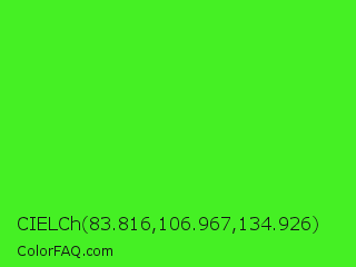 CIELCh 83.816,106.967,134.926 Color is a normal green color and the nearest color is Neon Green #39ff14. Hex code #45f024 and RGB value is rgb(69,240,36). In RGB color space, this color is composed of 27% red, 94% green, 14% blue, In CMYK color space, this color is composed of 71% cyan, 0% magenta, 85% yellow , 6% black , In HSL color space, this color has a hue angle of 110° , 87% saturation and 54% lightness.