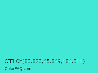 CIELCh 83.823,45.849,184.311 Color is a normal cyan color and the nearest color is Turquoise #40e0d0. Hex code #42e8d6 and RGB value is rgb(66,232,214). In RGB color space, this color is composed of 26% red, 91% green, 84% blue, In CMYK color space, this color is composed of 72% cyan, 0% magenta, 8% yellow , 9% black , In HSL color space, this color has a hue angle of 173° , 78% saturation and 58% lightness.