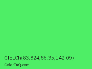 CIELCh 83.824,86.35,142.09 Color is a light green color and the nearest color is Screamin Green #66ff66. Hex code #4eee66 and RGB value is rgb(78,238,102). In RGB color space, this color is composed of 31% red, 93% green, 40% blue, In CMYK color space, this color is composed of 67% cyan, 0% magenta, 57% yellow , 7% black , In HSL color space, this color has a hue angle of 129° , 82% saturation and 62% lightness.