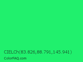 CIELCh 83.826,88.791,145.941 Color is a normal green color and the nearest color is Spring Green #00ff7f. Hex code #20f06d and RGB value is rgb(32,240,109). In RGB color space, this color is composed of 13% red, 94% green, 43% blue, In CMYK color space, this color is composed of 87% cyan, 0% magenta, 55% yellow , 6% black , In HSL color space, this color has a hue angle of 142° , 87% saturation and 53% lightness.