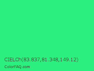 CIELCh 83.837,81.348,149.12 Color is a normal green color and the nearest color is UFO Green #3cd070. Hex code #2bef7e and RGB value is rgb(43,239,126). In RGB color space, this color is composed of 17% red, 94% green, 49% blue, In CMYK color space, this color is composed of 82% cyan, 0% magenta, 47% yellow , 6% black , In HSL color space, this color has a hue angle of 145° , 86% saturation and 55% lightness.