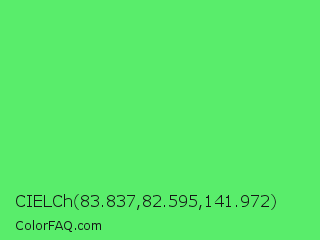 CIELCh 83.837,82.595,141.972 Color is a light green color and the nearest color is Screamin Green #66ff66. Hex code #59ed6b and RGB value is rgb(89,237,107). In RGB color space, this color is composed of 35% red, 93% green, 42% blue, In CMYK color space, this color is composed of 62% cyan, 0% magenta, 55% yellow , 7% black , In HSL color space, this color has a hue angle of 127° , 80% saturation and 64% lightness.