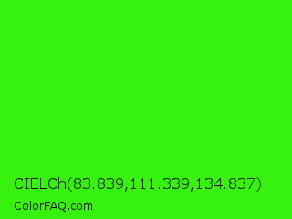 CIELCh 83.839,111.339,134.837 Color is a normal green color and the nearest color is Neon Green #39ff14. Hex code #37f10f and RGB value is rgb(55,241,15). In RGB color space, this color is composed of 22% red, 95% green, 6% blue, In CMYK color space, this color is composed of 77% cyan, 0% magenta, 94% yellow , 5% black , In HSL color space, this color has a hue angle of 109° , 89% saturation and 50% lightness.