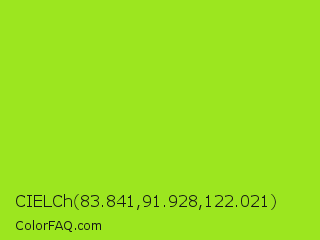 CIELCh 83.841,91.928,122.021 Color is a normal green color and the nearest color is Inch Worm #b0e313. Hex code #9ce61f and RGB value is rgb(156,230,31). In RGB color space, this color is composed of 61% red, 90% green, 12% blue, In CMYK color space, this color is composed of 32% cyan, 0% magenta, 87% yellow , 10% black , In HSL color space, this color has a hue angle of 82° , 80% saturation and 51% lightness.