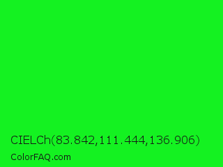 CIELCh 83.842,111.444,136.906 Color is a normal green color and the nearest color is Green #00ff00. Hex code #14f221 and RGB value is rgb(20,242,33). In RGB color space, this color is composed of 8% red, 95% green, 13% blue, In CMYK color space, this color is composed of 92% cyan, 0% magenta, 86% yellow , 5% black , In HSL color space, this color has a hue angle of 124° , 90% saturation and 51% lightness.