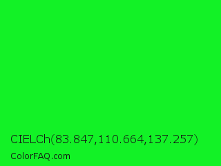 CIELCh 83.847,110.664,137.257 Color is a normal green color and the nearest color is Vivid Malachite #00cc33. Hex code #12f226 and RGB value is rgb(18,242,38). In RGB color space, this color is composed of 7% red, 95% green, 15% blue, In CMYK color space, this color is composed of 93% cyan, 0% magenta, 84% yellow , 5% black , In HSL color space, this color has a hue angle of 125° , 90% saturation and 51% lightness.