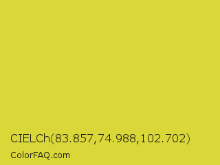CIELCh 83.857,74.988,102.702 Color is a normal yellow color and the nearest color is Wattle #dcd747. Hex code #dad738 and RGB value is rgb(218,215,56). In RGB color space, this color is composed of 85% red, 84% green, 22% blue, In CMYK color space, this color is composed of 0% cyan, 1% magenta, 74% yellow , 15% black , In HSL color space, this color has a hue angle of 59° , 69% saturation and 54% lightness.