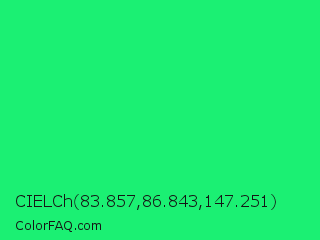 CIELCh 83.857,86.843,147.251 Color is a normal green color and the nearest color is Spring Green #00ff7f. Hex code #1bf073 and RGB value is rgb(27,240,115). In RGB color space, this color is composed of 11% red, 94% green, 45% blue, In CMYK color space, this color is composed of 89% cyan, 0% magenta, 52% yellow , 6% black , In HSL color space, this color has a hue angle of 145° , 88% saturation and 52% lightness.