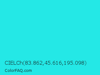 CIELCh 83.862,45.616,195.098 Color is a normal cyan color and the nearest color is Bright Turquoise #08e8de. Hex code #24e8e6 and RGB value is rgb(36,232,230). In RGB color space, this color is composed of 14% red, 91% green, 90% blue, In CMYK color space, this color is composed of 84% cyan, 0% magenta, 1% yellow , 9% black , In HSL color space, this color has a hue angle of 179° , 81% saturation and 53% lightness.