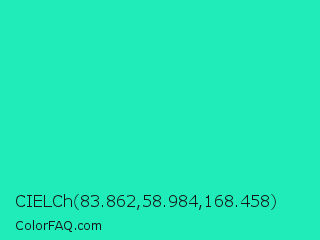 CIELCh 83.862,58.984,168.458 Color is a normal cyan color and the nearest color is Turquoise PWG #30d5c8. Hex code #20ecb9 and RGB value is rgb(32,236,185). In RGB color space, this color is composed of 13% red, 93% green, 73% blue, In CMYK color space, this color is composed of 86% cyan, 0% magenta, 22% yellow , 7% black , In HSL color space, this color has a hue angle of 165° , 84% saturation and 53% lightness.