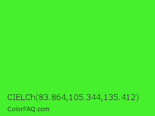 CIELCh 83.864,105.344,135.412 Color is a normal green color and the nearest color is Neon Green #39ff14. Hex code #46f02c and RGB value is rgb(70,240,44). In RGB color space, this color is composed of 27% red, 94% green, 17% blue, In CMYK color space, this color is composed of 71% cyan, 0% magenta, 82% yellow , 6% black , In HSL color space, this color has a hue angle of 112° , 87% saturation and 56% lightness.