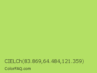 CIELCh 83.869,64.484,121.359 Color is a light green color and the nearest color is Inchworm #b2ec5d. Hex code #b3e064 and RGB value is rgb(179,224,100). In RGB color space, this color is composed of 70% red, 88% green, 39% blue, In CMYK color space, this color is composed of 20% cyan, 0% magenta, 55% yellow , 12% black , In HSL color space, this color has a hue angle of 82° , 67% saturation and 64% lightness.