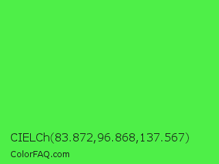 CIELCh 83.872,96.868,137.567 Color is a light green color and the nearest color is Screamin Green #66ff66. Hex code #4eef48 and RGB value is rgb(78,239,72). In RGB color space, this color is composed of 31% red, 94% green, 28% blue, In CMYK color space, this color is composed of 67% cyan, 0% magenta, 70% yellow , 6% black , In HSL color space, this color has a hue angle of 118° , 84% saturation and 61% lightness.