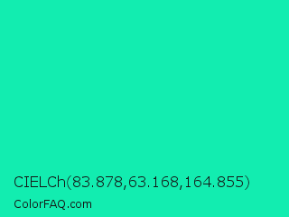 CIELCh 83.878,63.168,164.855 Color is a normal green color and the nearest color is Medium Spring Green #00fa9a. Hex code #12edb0 and RGB value is rgb(18,237,176). In RGB color space, this color is composed of 7% red, 93% green, 69% blue, In CMYK color space, this color is composed of 92% cyan, 0% magenta, 26% yellow , 7% black , In HSL color space, this color has a hue angle of 163° , 86% saturation and 50% lightness.