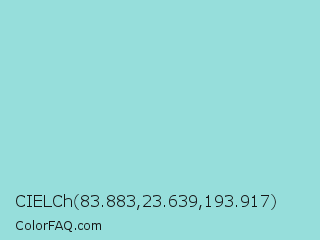 CIELCh 83.883,23.639,193.917 Color is a light cyan color and the nearest color is Morning Glory #9edee0. Hex code #96dedb and RGB value is rgb(150,222,219). In RGB color space, this color is composed of 59% red, 87% green, 86% blue, In CMYK color space, this color is composed of 32% cyan, 0% magenta, 1% yellow , 13% black , In HSL color space, this color has a hue angle of 178° , 52% saturation and 73% lightness.