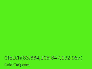 CIELCh 83.884,105.847,132.957 Color is a normal green color and the nearest color is Chlorophyll Green #4aff00. Hex code #57ef1c and RGB value is rgb(87,239,28). In RGB color space, this color is composed of 34% red, 94% green, 11% blue, In CMYK color space, this color is composed of 64% cyan, 0% magenta, 88% yellow , 6% black , In HSL color space, this color has a hue angle of 103° , 87% saturation and 52% lightness.