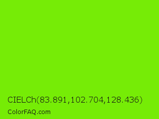 CIELCh 83.891,102.704,128.436 Color is a normal green color and the nearest color is Lawn Green #7cfc00. Hex code #76ec06 and RGB value is rgb(118,236,6). In RGB color space, this color is composed of 46% red, 93% green, 2% blue, In CMYK color space, this color is composed of 50% cyan, 0% magenta, 97% yellow , 7% black , In HSL color space, this color has a hue angle of 91° , 95% saturation and 47% lightness.