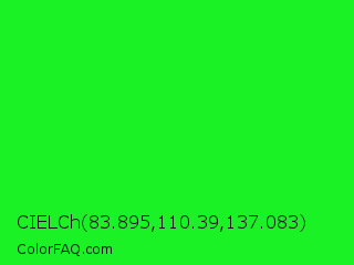 CIELCh 83.895,110.39,137.083 Color is a normal green color and the nearest color is Neon Green #39ff14. Hex code #1af226 and RGB value is rgb(26,242,38). In RGB color space, this color is composed of 10% red, 95% green, 15% blue, In CMYK color space, this color is composed of 89% cyan, 0% magenta, 84% yellow , 5% black , In HSL color space, this color has a hue angle of 123° , 89% saturation and 53% lightness.