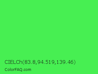 CIELCh 83.8,94.519,139.46 Color is a light green color and the nearest color is Screamin Green #66ff66. Hex code #47ef52 and RGB value is rgb(71,239,82). In RGB color space, this color is composed of 28% red, 94% green, 32% blue, In CMYK color space, this color is composed of 70% cyan, 0% magenta, 66% yellow , 6% black , In HSL color space, this color has a hue angle of 124° , 84% saturation and 61% lightness.