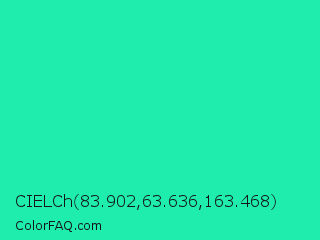 CIELCh 83.902,63.636,163.468 Color is a normal green color and the nearest color is Medium Spring Green #00fa9a. Hex code #1fedad and RGB value is rgb(31,237,173). In RGB color space, this color is composed of 12% red, 93% green, 68% blue, In CMYK color space, this color is composed of 87% cyan, 0% magenta, 27% yellow , 7% black , In HSL color space, this color has a hue angle of 161° , 85% saturation and 53% lightness.