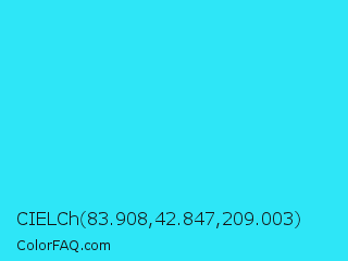 CIELCh 83.908,42.847,209.003 Color is a normal cyan color and the nearest color is Loeen #15f2fd. Hex code #2ee6f7 and RGB value is rgb(46,230,247). In RGB color space, this color is composed of 18% red, 90% green, 97% blue, In CMYK color space, this color is composed of 81% cyan, 7% magenta, 0% yellow , 3% black , In HSL color space, this color has a hue angle of 185° , 93% saturation and 57% lightness.