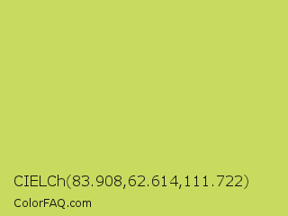 CIELCh 83.908,62.614,111.722 Color is a light yellow color and the nearest color is June Bud #bdda57. Hex code #c9db5e and RGB value is rgb(201,219,94). In RGB color space, this color is composed of 79% red, 86% green, 37% blue, In CMYK color space, this color is composed of 8% cyan, 0% magenta, 57% yellow , 14% black , In HSL color space, this color has a hue angle of 69° , 63% saturation and 61% lightness.