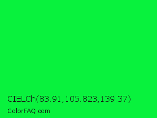 CIELCh 83.91,105.823,139.37 Color is a normal green color and the nearest color is Malachite #0bda51. Hex code #08f23d and RGB value is rgb(8,242,61). In RGB color space, this color is composed of 3% red, 95% green, 24% blue, In CMYK color space, this color is composed of 97% cyan, 0% magenta, 75% yellow , 5% black , In HSL color space, this color has a hue angle of 134° , 94% saturation and 49% lightness.