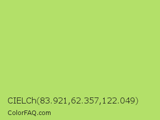 CIELCh 83.921,62.357,122.049 Color is a light green color and the nearest color is Inchworm #b2ec5d. Hex code #b3e069 and RGB value is rgb(179,224,105). In RGB color space, this color is composed of 70% red, 88% green, 41% blue, In CMYK color space, this color is composed of 20% cyan, 0% magenta, 53% yellow , 12% black , In HSL color space, this color has a hue angle of 83° , 66% saturation and 65% lightness.