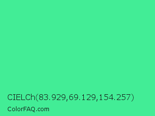 CIELCh 83.929,69.129,154.257 Color is a normal green color and the nearest color is Eucalyptus #44d7a8. Hex code #42ed96 and RGB value is rgb(66,237,150). In RGB color space, this color is composed of 26% red, 93% green, 59% blue, In CMYK color space, this color is composed of 72% cyan, 0% magenta, 37% yellow , 7% black , In HSL color space, this color has a hue angle of 149° , 83% saturation and 59% lightness.