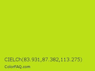CIELCh 83.931,87.382,113.275 Color is a normal lime color and the nearest color is Fuego #bede0d. Hex code #bbe016 and RGB value is rgb(187,224,22). In RGB color space, this color is composed of 73% red, 88% green, 9% blue, In CMYK color space, this color is composed of 17% cyan, 0% magenta, 90% yellow , 12% black , In HSL color space, this color has a hue angle of 71° , 82% saturation and 48% lightness.
