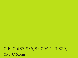CIELCh 83.936,87.094,113.329 Color is a normal lime color and the nearest color is Fuego #bede0d. Hex code #bbe018 and RGB value is rgb(187,224,24). In RGB color space, this color is composed of 73% red, 88% green, 9% blue, In CMYK color space, this color is composed of 17% cyan, 0% magenta, 89% yellow , 12% black , In HSL color space, this color has a hue angle of 71° , 81% saturation and 49% lightness.