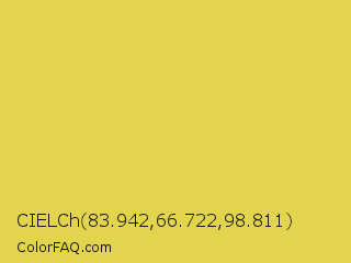 CIELCh 83.942,66.722,98.811 Color is a normal yellow color and the nearest color is Wattle #dcd747. Hex code #e3d44d and RGB value is rgb(227,212,77). In RGB color space, this color is composed of 89% red, 83% green, 30% blue, In CMYK color space, this color is composed of 0% cyan, 7% magenta, 66% yellow , 11% black , In HSL color space, this color has a hue angle of 54° , 73% saturation and 60% lightness.