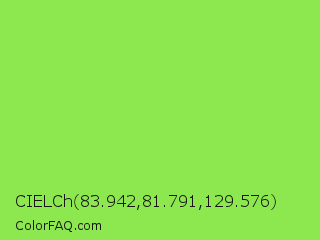 CIELCh 83.942,81.791,129.576 Color is a light green color and the nearest color is Kiwi #8ee53f. Hex code #8de850 and RGB value is rgb(141,232,80). In RGB color space, this color is composed of 55% red, 91% green, 31% blue, In CMYK color space, this color is composed of 39% cyan, 0% magenta, 66% yellow , 9% black , In HSL color space, this color has a hue angle of 96° , 77% saturation and 61% lightness.