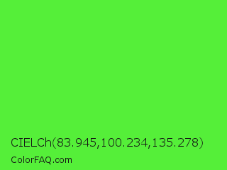 CIELCh 83.945,100.234,135.278 Color is a normal green color and the nearest color is Neon Green #39ff14. Hex code #55ef39 and RGB value is rgb(85,239,57). In RGB color space, this color is composed of 33% red, 94% green, 22% blue, In CMYK color space, this color is composed of 64% cyan, 0% magenta, 76% yellow , 6% black , In HSL color space, this color has a hue angle of 111° , 85% saturation and 58% lightness.