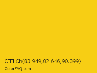 CIELCh 83.949,82.646,90.399 Color is a normal yellow color and the nearest color is Jonquil #f4ca16. Hex code #f7ce14 and RGB value is rgb(247,206,20). In RGB color space, this color is composed of 97% red, 81% green, 8% blue, In CMYK color space, this color is composed of 0% cyan, 17% magenta, 92% yellow , 3% black , In HSL color space, this color has a hue angle of 49° , 93% saturation and 52% lightness.