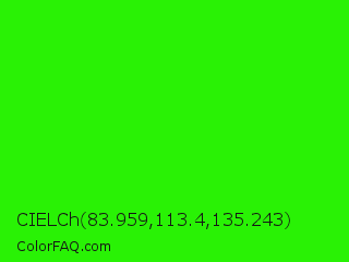 CIELCh 83.959,113.4,135.243 Color is a normal green color and the nearest color is Neon Green #39ff14. Hex code #29f205 and RGB value is rgb(41,242,5). In RGB color space, this color is composed of 16% red, 95% green, 2% blue, In CMYK color space, this color is composed of 83% cyan, 0% magenta, 98% yellow , 5% black , In HSL color space, this color has a hue angle of 111° , 96% saturation and 48% lightness.