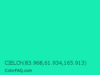 CIELCh 83.968,61.934,165.913 Color is a normal cyan color and the nearest color is Medium Spring Green #00fa9a. Hex code #17edb3 and RGB value is rgb(23,237,179). In RGB color space, this color is composed of 9% red, 93% green, 70% blue, In CMYK color space, this color is composed of 90% cyan, 0% magenta, 24% yellow , 7% black , In HSL color space, this color has a hue angle of 164° , 86% saturation and 51% lightness.